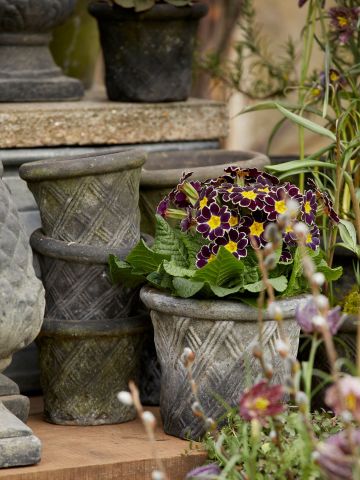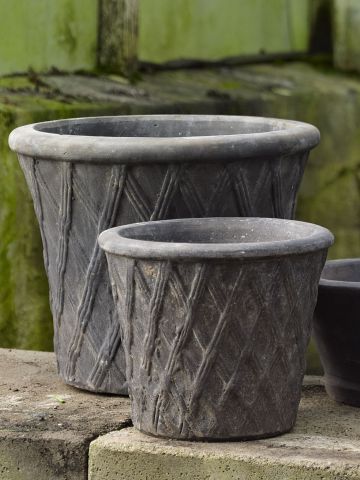 Den har et smukt mønster, der leder tankerne hen på traditionelle harlekin-ruder, og med den naturlige patina passer den perfekt ind i både moderne og klassiske haveindretninger. Krukkens patina og tekstur udvikler sig smukt over tid, især når den udsættes for vejrets elementer, hvilket giver den et endnu mere karakterfuldt look.